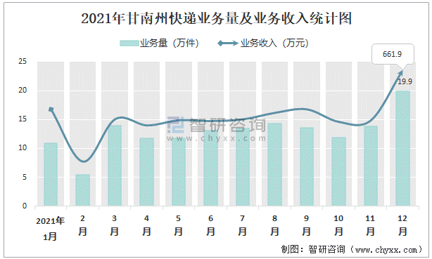 2016-2021年甘南州快遞業務量及業務收入統計圖