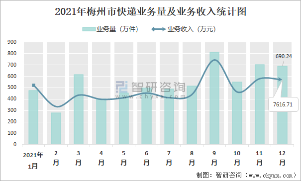 2021年梅州市快遞業務量及業務收入統計圖