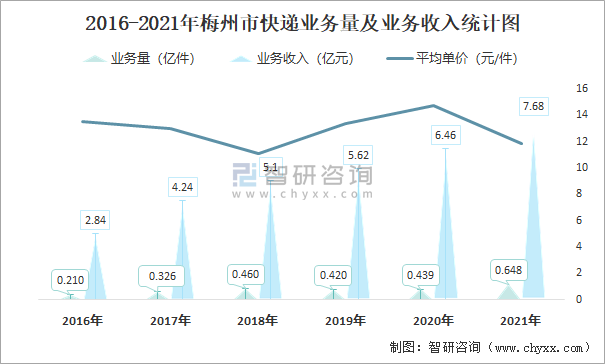 2016-2021年梅州市快遞業務量及業務收入統計圖