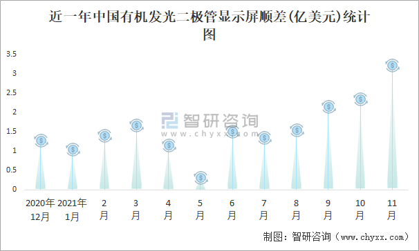 近一年中國有機發(fā)光二極管顯示屏順差(億美元)統(tǒng)計圖