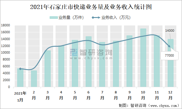 2021年12月石家莊市快遞業務量與業務收入分別為14000萬件和77000萬元