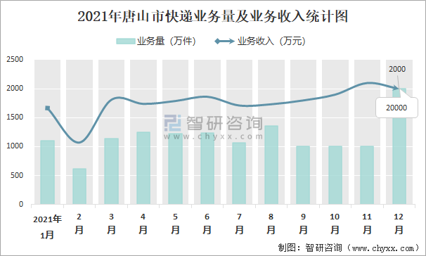 2016-2021年唐山市快遞業務量及業務收入統計圖