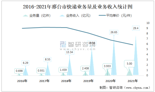 2016-2021年邢臺(tái)市快遞業(yè)務(wù)量及業(yè)務(wù)收入統(tǒng)計(jì)圖