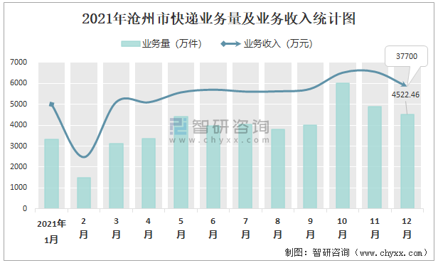 根據各省市郵政局數據可知:2021年12月滄州市快遞業務量為4522.46萬件,業務收入為37700萬元;2021年1-12月滄州市快遞累計業務量為46000萬件,同比增長40.1%,累計業務收入為418000萬元,同比增長28.9%;2016-2021年滄州市快遞業務量與業務收入均逐年遞增,平均單價總體呈現下降趨勢。
