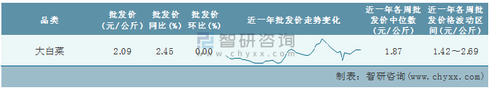 根據農村農業部數據統計可知:2022年第7周全國大白菜平均批發價為2.09元/公斤,同比增加2.45%,環比下跌0%,近一年全國大白菜平均批發價最高達到2.69元/公斤,批發價最低也要1.42元/公斤。