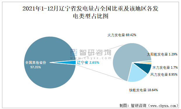 2021年1-12月遼寧省發(fā)電量占全國比重及該地區(qū)各發(fā)電類型占比圖