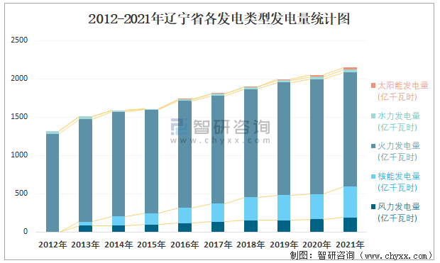 2012-2021年遼寧省各發(fā)電類型發(fā)電量統(tǒng)計圖