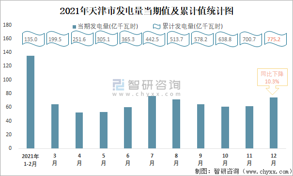 根據國家統計局數據統計可知:2021年12月天津市發電量為74.3億千瓦時,同比下降10.3%,2021年1-12月天津市發電量為775.2億千瓦時,累計增長1.9%;2021年1-12月天津市主要有3種類型發電量,發電量占全國比重約為0.96%,其中火力發電量為752億千瓦時,占天津市發電量比重約為97.01%,占全國發電量比重約為0.93%,是天津市最大發電量類型,目前天津市暫無核能發電量與水力發電量。