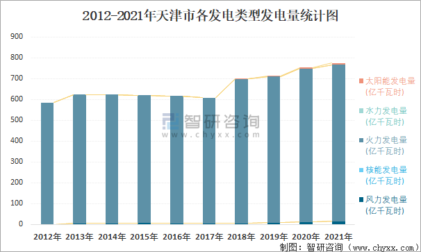 根據國家統計局數據統計可知:2012-2021年天津市發電量有所波動,總體呈現上升趨勢,從發電量類型來看,火力發電量占比最大(2021年占比為97.01%),且近10年有所波動,總體呈現上升趨勢。