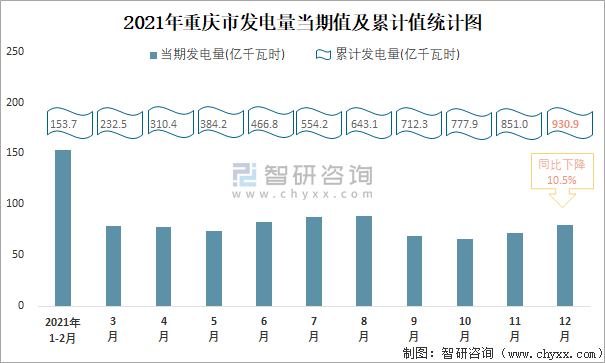2021年重慶市發電量當期值及累計值統計圖