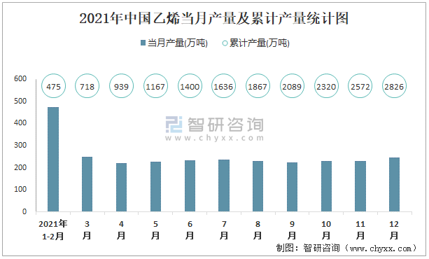 根據國家統計局數據顯示:2021年12月中國乙烯產量為245萬噸,同比增長2.5%;2021年1-12月中國乙烯累計產量為2825.7萬噸,累計增長18.3%;2016-2021年中國乙烯產量逐年遞增,2021年達到最高。