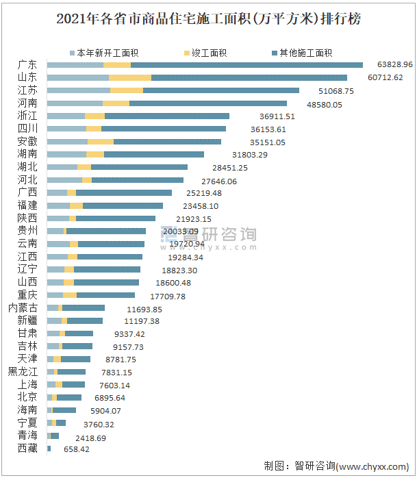 2021年各省市商品住宅施工面積(萬平方米)排行榜