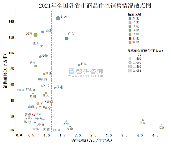 根據國家統計局數據統計可知:2021年北京和上海商品住宅銷售均價遙遙領先于其他各省市,江蘇的銷售商品住宅面積處于top1,江蘇、河南、廣東的商品住宅現房銷售面積較多(散點圓圈大小代表現房銷售面積)。以銷售面積和銷售均價的均值作為四象限分界線,北京、上海、海南、天津處于第四象限,商品住宅均價高,銷售面積少;房價低銷售面積低的第三象限以華北地區、東北地區、西北地區的省市為主。