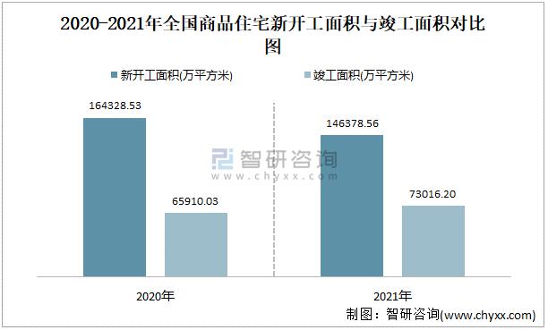 2020-2021年全國商品住宅新開工面積與竣工面積對比圖