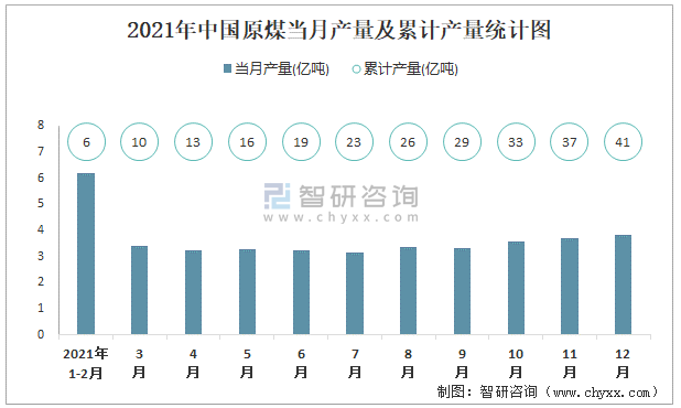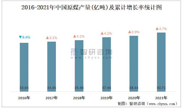 根據國家統計局數據顯示:2021年12月中國原煤產量為3.8億噸,同比增長7.2%;2021年1-12月中國原煤累計產量為40.7億噸,累計增長4.7%;2016-2021年中國原煤產量總體呈現上升趨勢。