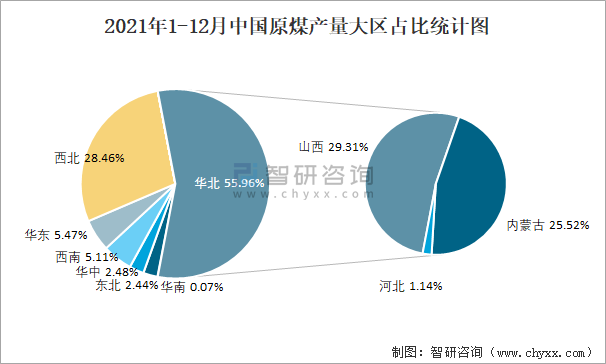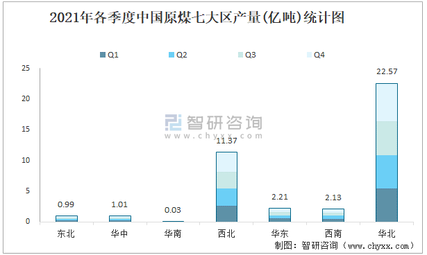 根據國家統計局數據顯示:2021年各季度中國原煤主要集中在華北、西北、華東地區生產;2021年1-12月中國原煤產量大區分布不均衡,其中華北地區產量最高,特別是山西省貢獻了最多產量;2021年1-12月中國原煤各省市產量中山西和內蒙古兩省產量領先于其他省份。