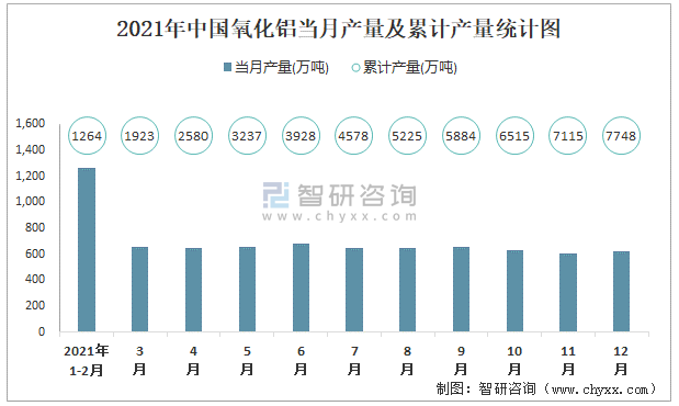 2021年中國氧化鋁當月產量及累計產量統計圖