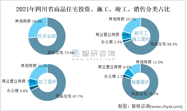 2021年四川省商品住宅投資、施工、竣工、銷售分類占比