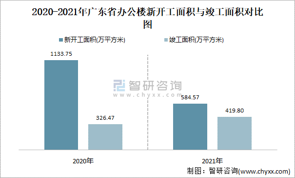 2020-2021年廣東省辦公樓新開工面積與竣工面積對比圖