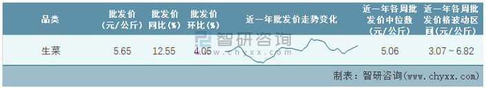 根據(jù)農(nóng)村農(nóng)業(yè)部數(shù)據(jù)統(tǒng)計可知:2022年第8周全國生菜平均批發(fā)價為5.65元/公斤,同比增加12.55%,環(huán)比增加4.05%,近一年全國生菜平均批發(fā)價最高達(dá)到6.82元/公斤,批發(fā)價最低也要3.07元/公斤。