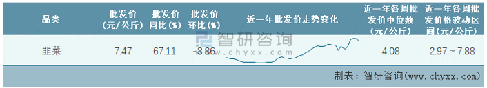 根據農村農業部數據統計可知:2022年第8周全國韭菜平均批發價為7.47元/公斤,同比增加67.11%,環比下跌3.86%,近一年全國韭菜平均批發價最高達到7.88元/公斤,批發價最低也要2.97元/公斤。