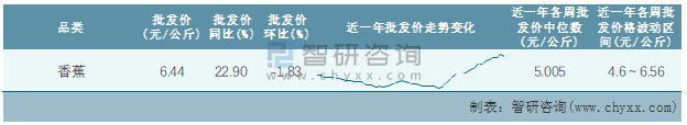 根據農村農業部數據統計可知:2022年第8周全國香蕉平均批發價為6.44元/公斤,同比增加22.9%,環比下跌1.83%,近一年全國香蕉平均批發價最高達到6.56元/公斤,批發價最低也要4.6元/公斤。