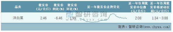 根據農村農業部數據統計可知:2022年第8周全國洋白菜平均批發價為2.46元/公斤,同比下跌6.46%,環比下跌1.99%,近一年全國洋白菜平均批發價最高達到3.88元/公斤,批發價最低也要1.34元/公斤。