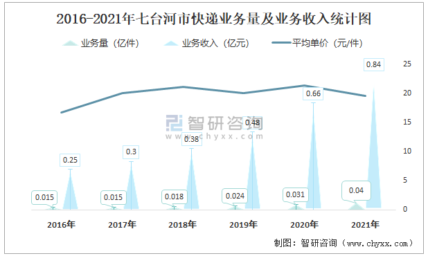 2016-2021年七臺河市快遞業務量及業務收入統計圖