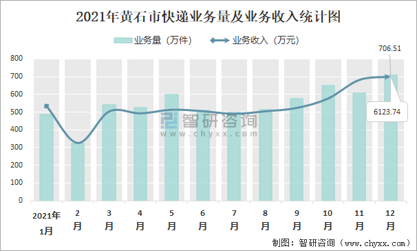 2021年黃石市快遞業(yè)務(wù)量及業(yè)務(wù)收入統(tǒng)計(jì)圖