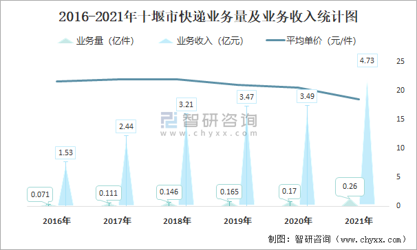 根據(jù)各省市郵政局?jǐn)?shù)據(jù)可知:2021年12月十堰市快遞業(yè)務(wù)量為194.61萬件,業(yè)務(wù)收入為4612.28萬元;2021年1-12月十堰市快遞累計(jì)業(yè)務(wù)量為2545.2萬件,同比增長49.31%,累計(jì)業(yè)務(wù)收入為47313.76萬元,同比增長35.53%;2016-2021年十堰市快遞業(yè)務(wù)量與業(yè)務(wù)收入均逐年遞增,平均單價(jià)總體呈現(xiàn)下降趨勢。