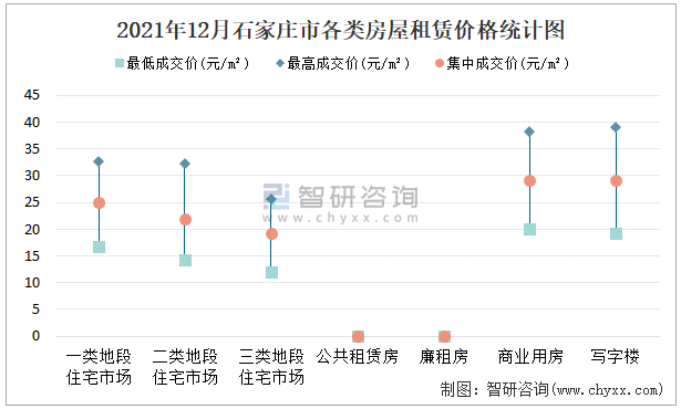 根據國信房地產信息網數據可知:2021年12月石家莊市7類房屋中,公共租賃房、廉租房無統計數據;商業用房租賃最低成交價、集中成交價均高于其他類房屋價格,寫字樓租賃最高成交價最高,為39元/㎡;三類地段住宅市場租賃集中成交價約為19.15元/㎡。