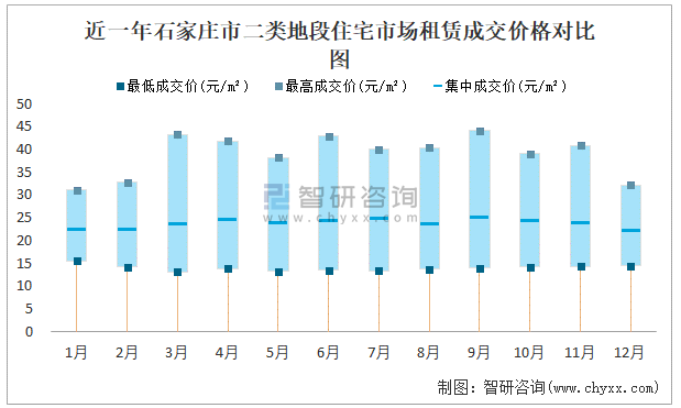 近一年石家莊市二類地段住宅市場租賃成交價格對比圖