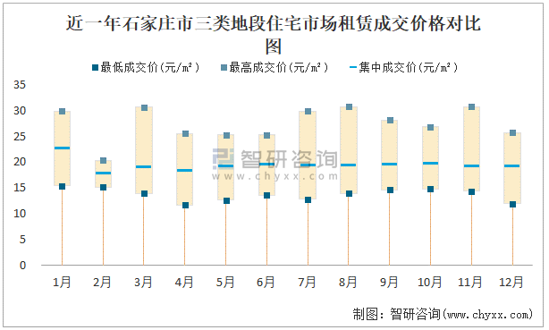 根據國信房地產信息網數據可知:近一年石家莊市一類地段住宅市場租賃成交價格有一定幅度波動,12月最高成交價與最低成交價差距為15.83元/㎡;近一年石家莊市二類地段住宅市場租賃最低成交價與最高成交價的差距在15.57元/㎡-30.31元/㎡之間波動,2021年3月差距達到最大;近一年三類地段住宅市場租賃成交價在11.7元/㎡-30.76元/㎡之間波動。
