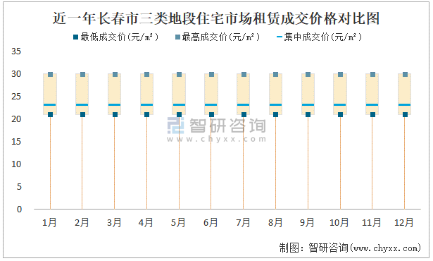 近一年長(zhǎng)春市三類地段住宅市場(chǎng)租賃成交價(jià)格對(duì)比圖