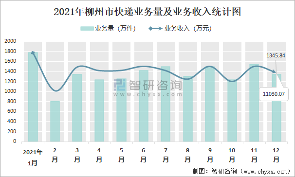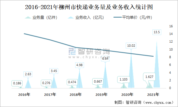 2016-2021年柳州市快遞業務量及業務收入統計圖