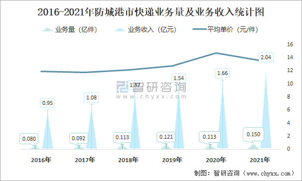 2016-2021年防城港市快遞業(yè)務(wù)量及業(yè)務(wù)收入統(tǒng)計(jì)圖