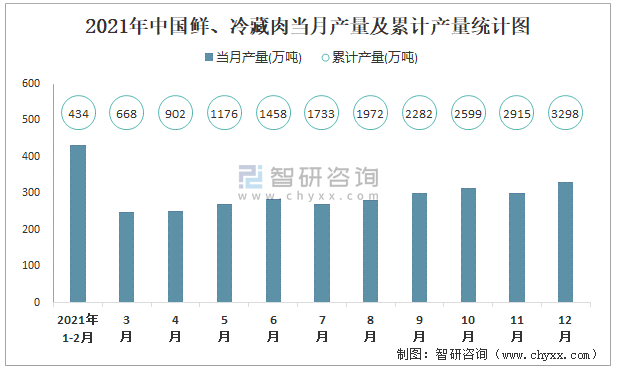 2021年中國鮮、冷藏肉當月產量及累計產量統計圖