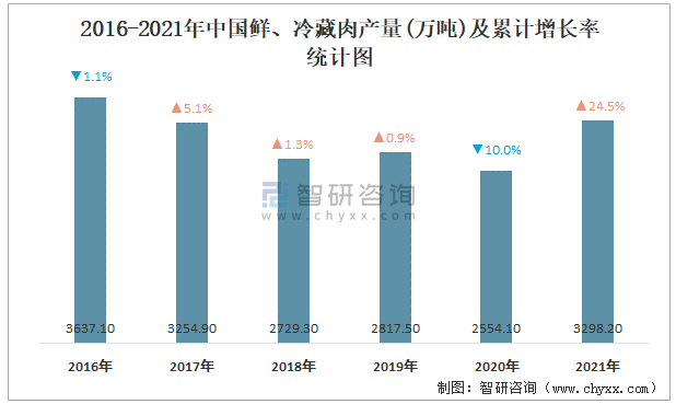 2016-2021年中國鮮、冷藏肉產量及累計增長率統計圖