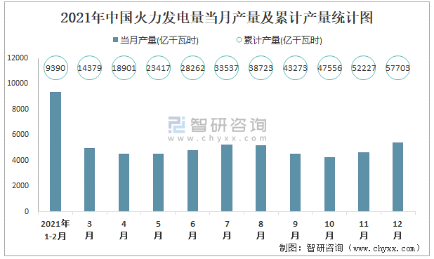 2021年中國火力發(fā)電量當(dāng)月產(chǎn)量及累計產(chǎn)量統(tǒng)計圖