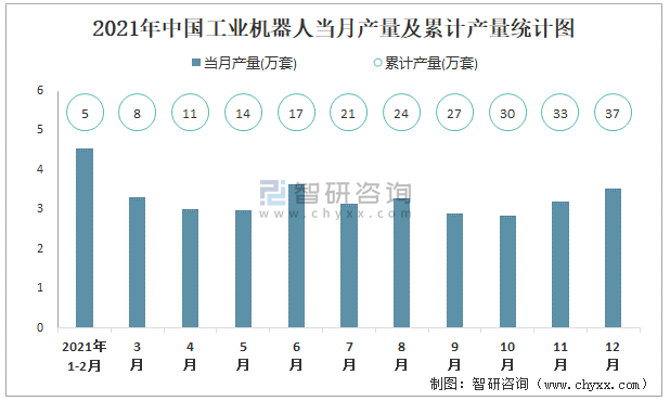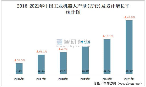 根據國家統計局數據顯示:2021年12月中國工業機器人產量為3.5萬套,同比增長15.1%;2021年1-12月中國工業機器人累計產量為36.6萬套,累計增長44.9%;2016-2021年中國工業機器人產量總體呈現上升趨勢。