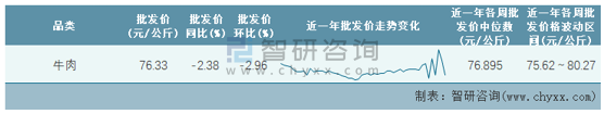 根據農村農業部數據統計可知:2022年第9周全國牛肉平均批發價為76.33元/公斤,同比下跌2.38%,環比下跌2.96%,近一年全國牛肉平均批發價最高達到80.27元/公斤,批發價最低也要75.62元/公斤。