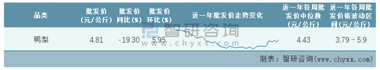 根據農村農業部數據統計可知:2022年第9周全國鴨梨平均批發價為4.81元/公斤,同比下跌19.3%,環比增加5.95%,近一年全國鴨梨平均批發價最高達到5.9元/公斤,批發價最低也要3.79元/公斤。