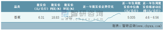 根據農村農業部數據統計可知:2022年第9周全國香蕉平均批發價為6.31元/公斤,同比增加18.83%,環比下跌2.02%,近一年全國香蕉平均批發價最高達到6.56元/公斤,批發價最低也要4.6元/公斤。