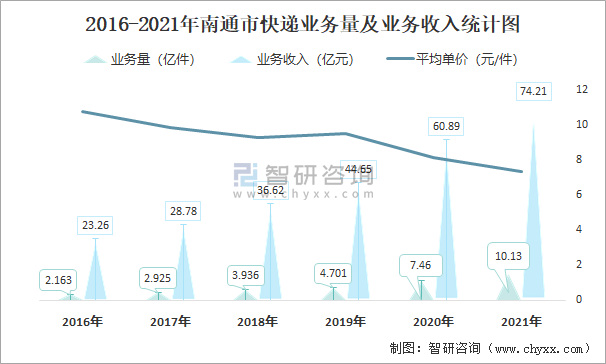 2016-2021年南通市快遞業(yè)務(wù)量及業(yè)務(wù)收入統(tǒng)計(jì)圖