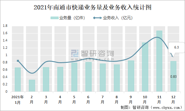 2021年南通市快遞業(yè)務(wù)量及業(yè)務(wù)收入統(tǒng)計(jì)圖
