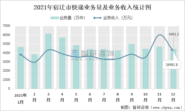 2021年宿遷市快遞業務量及業務收入統計圖