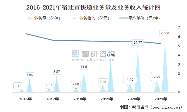 2016-2021年宿遷市快遞業務量及業務收入統計圖