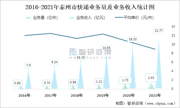 2016-2021年泰州市快遞業務量及業務收入統計圖