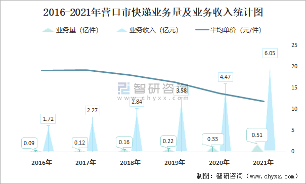 2016-2021年營口市快遞業(yè)務(wù)量及業(yè)務(wù)收入統(tǒng)計圖