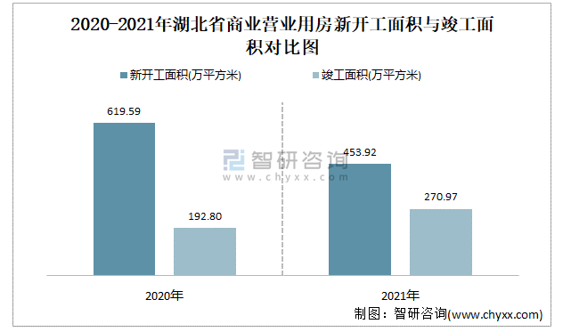 2020-2021年湖北省商業營業用房新開工面積與竣工面積對比圖
